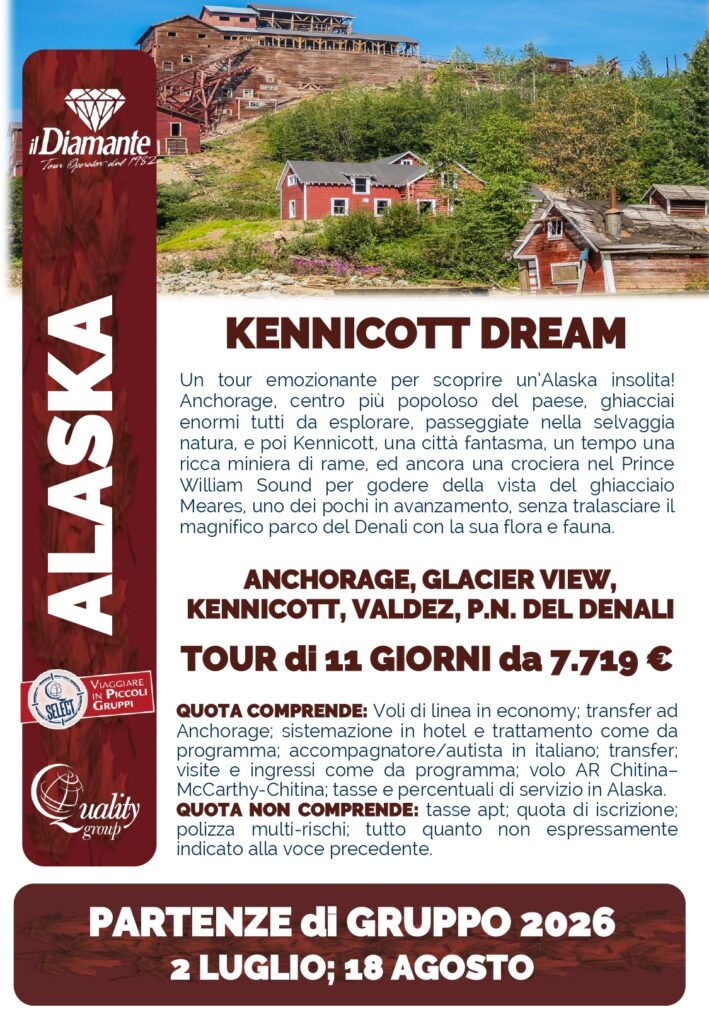 Se sogni un viaggio fuori dalle rotte più battute, l’Alaska è la destinazione perfetta. Con il tour Kennicott Dream vivrai un’esperienza unica tra paesaggi spettacolari, natura incontaminata e luoghi ricchi di storia.