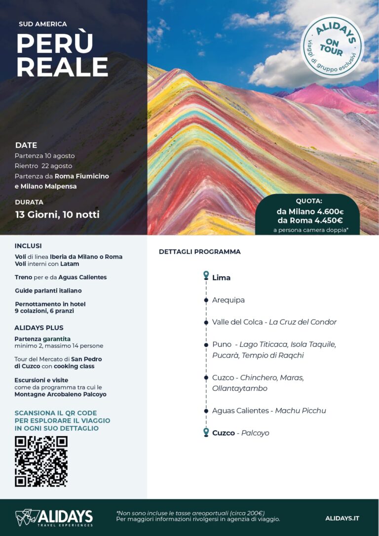 Un viaggio in Perù non è solo una vacanza: è un’esperienza intensa, emozionante e profondamente autentica. Con il tour Perù Reale by Alidays, potrai scoprire alcune delle meraviglie più iconiche del Sud America, accompagnato da guide esperte e con un itinerario completo e perfettamente organizzato.